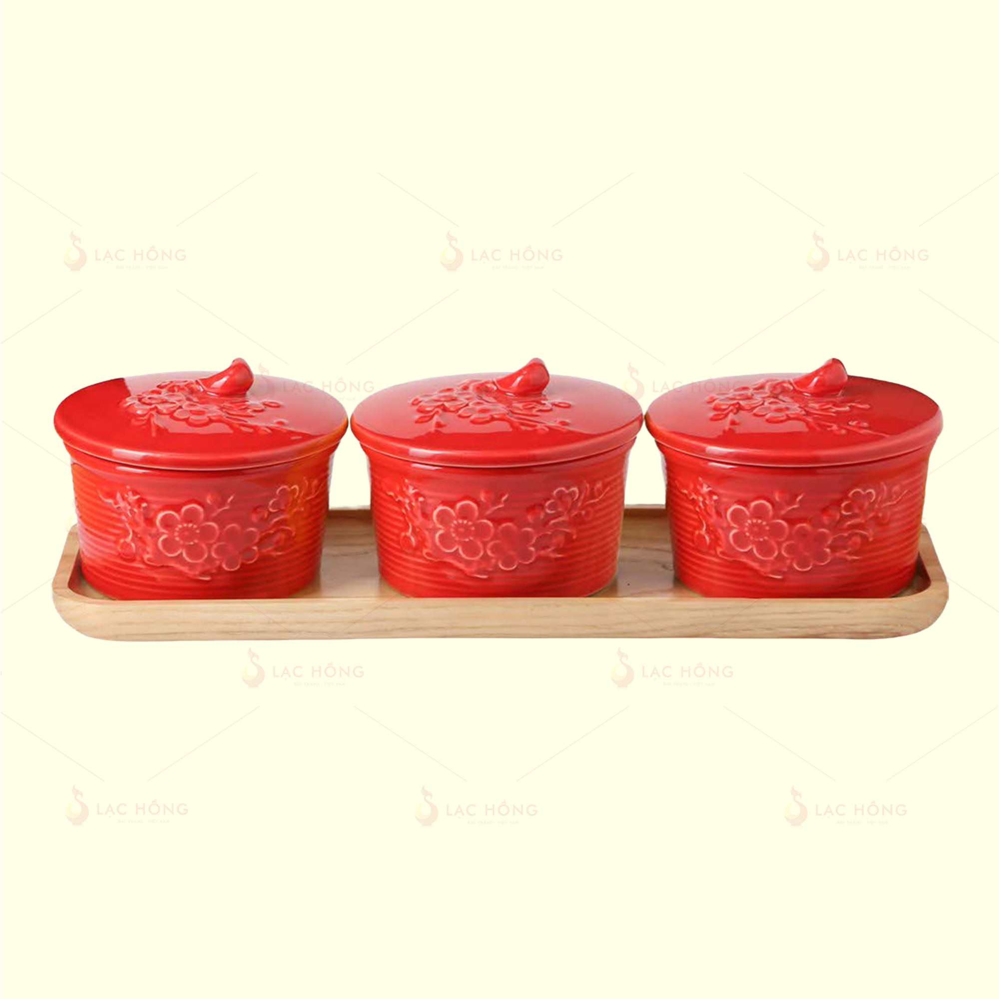 Bộ 3 Hũ Mứt Men Đỏ Hoa Đào Đắp Nổi