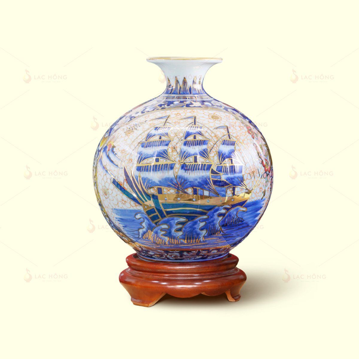 Men màu xanh biển trắng lấy cảm hứng từ đại dương nổi bật, được xem là biểu tượng của bình an, sự nghiệp hanh thông và nguồn tài lộc dồi dào, bất tận như biển cả trong phong thủy. Họa tiết Hải Vận Cát Tường kẻ vàng tinh tế với hình ảnh con thuyền lớn đang căng buồm no gió vượt biển được nghệ nhân vẽ tay tỉ mỉ. Các chi tiết còn được nhấn bằng viền vàng 24K làm tăng thêm vẻ sang trọng và giá trị thẩm mỹ.