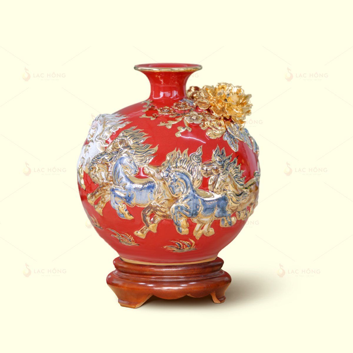 Quả Hút Lộc Men Đỏ Mã Đáo Thành Công Đắp Nổi Kẻ Vàng mang biểu tượng của sức mạnh, thịnh vượng và thành công rực rỡ. Hình ảnh tám chú ngựa tung vó tiến về phía trước thể hiện tinh thần kiên định, bền bỉ và khát vọng vươn xa trong công danh, sự nghiệp. Nền men đỏ tượng trưng cho may mắn và phú quý, kết hợp chi tiết đắp nổi kẻ vàng làm nổi bật vẻ sang trọng và quyền quý. Được chế tác thủ công tại