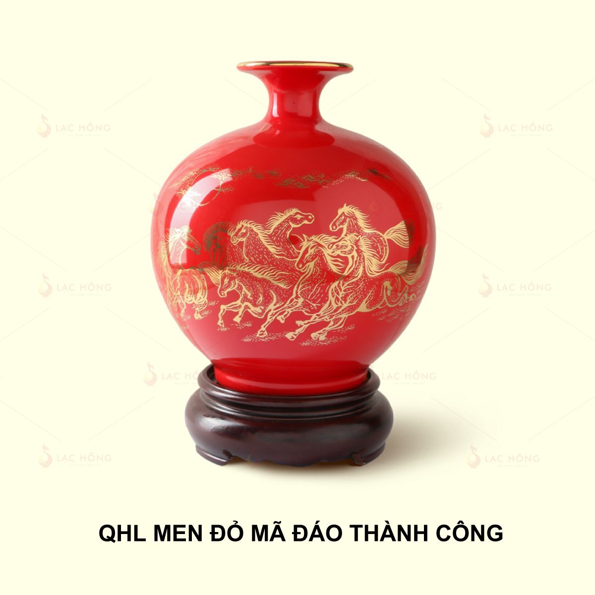 Men màu đỏ nổi bật, được xem là biểu tượng của may mắn, hạnh phúc, niềm vui và tài lộc sung túc theo quan niệm phong thủy truyền thống. Họa tiết Mã Đáo Thành Công kẻ vàng tinh tế với hình ảnh tám con ngựa dũng mãnh đang phi nước đại, tượng trưng cho tốc độ, sức mạnh và sự thành công vang dội ngay sau khi khởi đầu, được nghệ nhân vẽ tay tỉ mỉ. Các chi tiết còn được nhấn bằng viền vàng 24K làm tăng thêm vẻ sang trọng và giá trị thẩm mỹ.