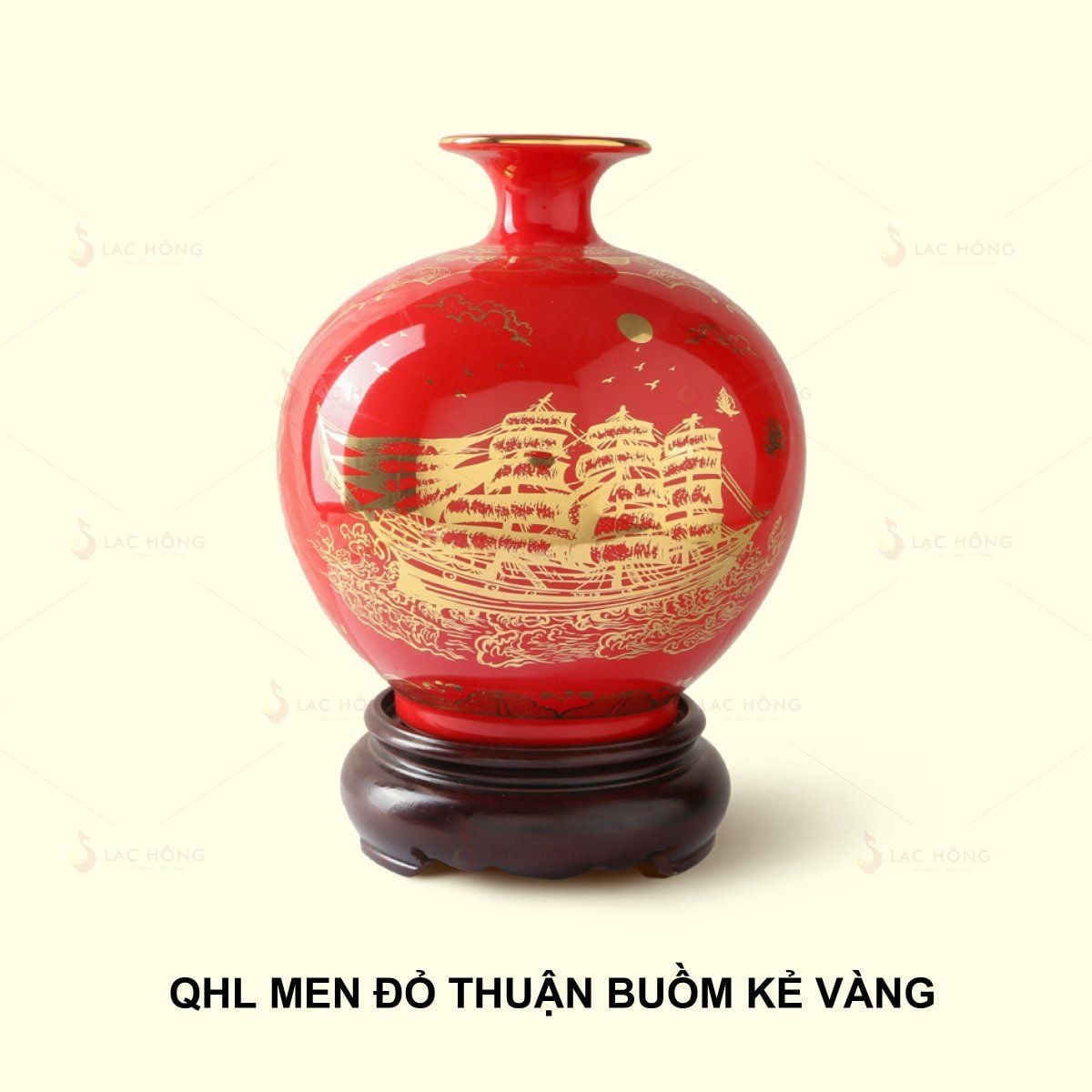 Men màu đỏ nổi bật, đại diện cho sự may mắn, tài lộc, hạnh phúc và nguồn năng lượng tích cực mạnh mẽ (hợp mệnh Hỏa và Thổ) trong phong thủy. Họa tiết Thuận Buồm Xuôi Gió kẻ vàng tinh tế với hình ảnh thuyền buồm lướt sóng, mang ý nghĩa mọi việc đều diễn ra suôn sẻ, không gặp trở ngại, được nghệ nhân vẽ tay tỉ mỉ. Các chi tiết còn được nhấn bằng viền vàng 24K làm tăng thêm vẻ sang trọng và giá trị thẩm mỹ.