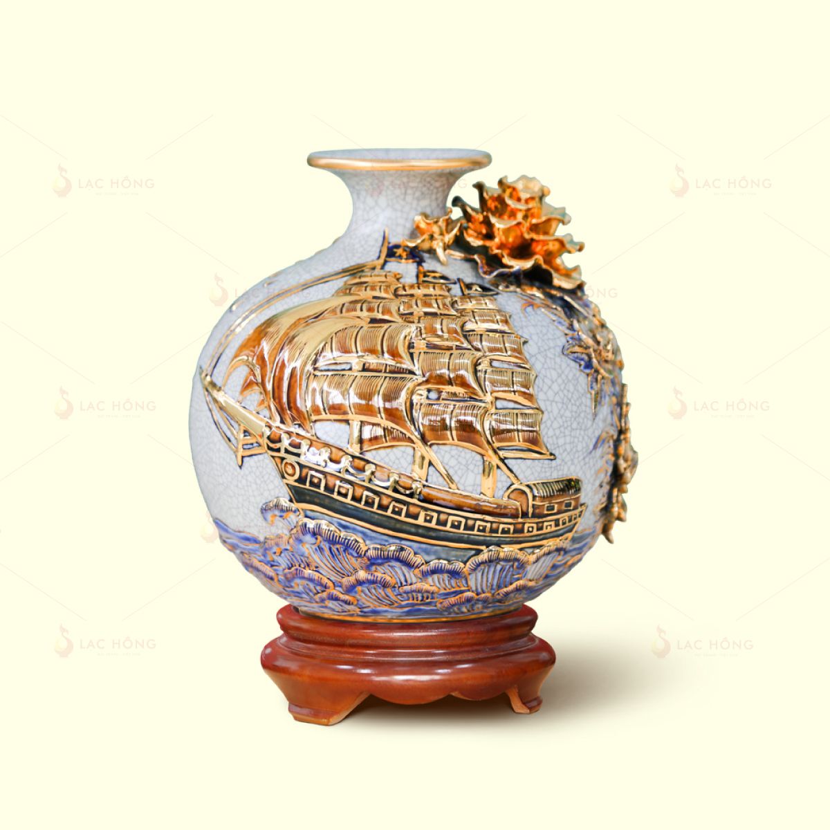 Quả hút lộc men rạn Thuận Buồm Xuôi Gió là một tác phẩm tinh xảo mang đậm dấu ấn của nghệ nhân gốm Lạc Hồng. Sản phẩm được tạo hình tròn đầy – biểu tượng cho sự viên mãn, đủ đầy trong cuộc sống. Nền men rạn cổ điển kết hợp họa tiết thuyền buồm đắp nổi kẻ vàng tinh tế, thể hiện hành trình thuận lợi, may mắn và thành công. Mỗi chi tiết vàng được vẽ tay tỉ mỉ giúp sản phẩm trở nên sang trọng, phù hợp để trưng bày trong phòng khách, văn phòng hay làm quà tặng phong thủy cao cấp.