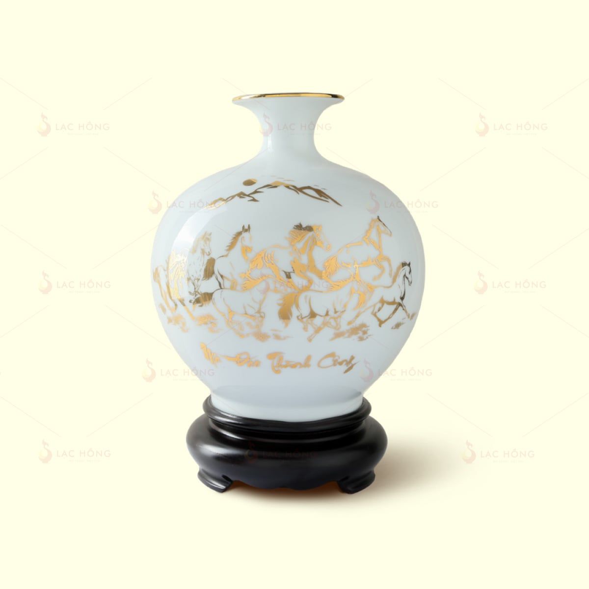Men màu trắng nổi bật, đại diện cho sự tinh khiết, minh bạch, sự khởi đầu suôn sẻ và may mắn, tiền tài theo quan niệm phong thủy. Họa tiết Mã Đáo Thành Công kẻ vàng tinh tế với hình ảnh tám con ngựa dũng mãnh đang phi nước đại, tượng trưng cho tốc độ, sức mạnh và sự thành công vang dội ngay sau khi khởi đầu, được nghệ nhân vẽ tay tỉ mỉ. Các chi tiết còn được nhấn bằng viền vàng 24K làm tăng thêm vẻ sang trọng và giá trị thẩm mỹ.