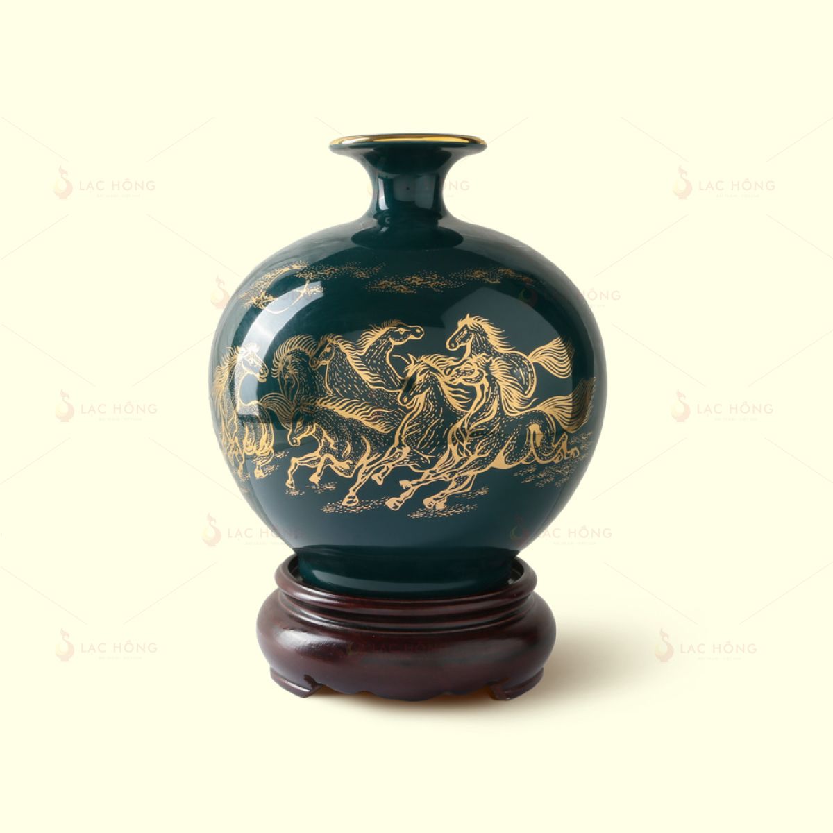 Men màu xanh cổ vịt nổi bật, đại diện cho sự phát triển, sinh sôi, sự tĩnh tại và tiền tài bền vững (Mộc và Thủy) trong phong thủy. Họa tiết Mã Đáo Thành Công kẻ vàng tinh tế với hình ảnh tám con ngựa dũng mãnh đang phi nước đại, tượng trưng cho tốc độ, sức mạnh và sự thành công vang dội ngay sau khi khởi đầu, được nghệ nhân vẽ tay tỉ mỉ. Các chi tiết còn được nhấn bằng viền vàng 24K làm tăng thêm vẻ sang trọng và giá trị thẩm mỹ.