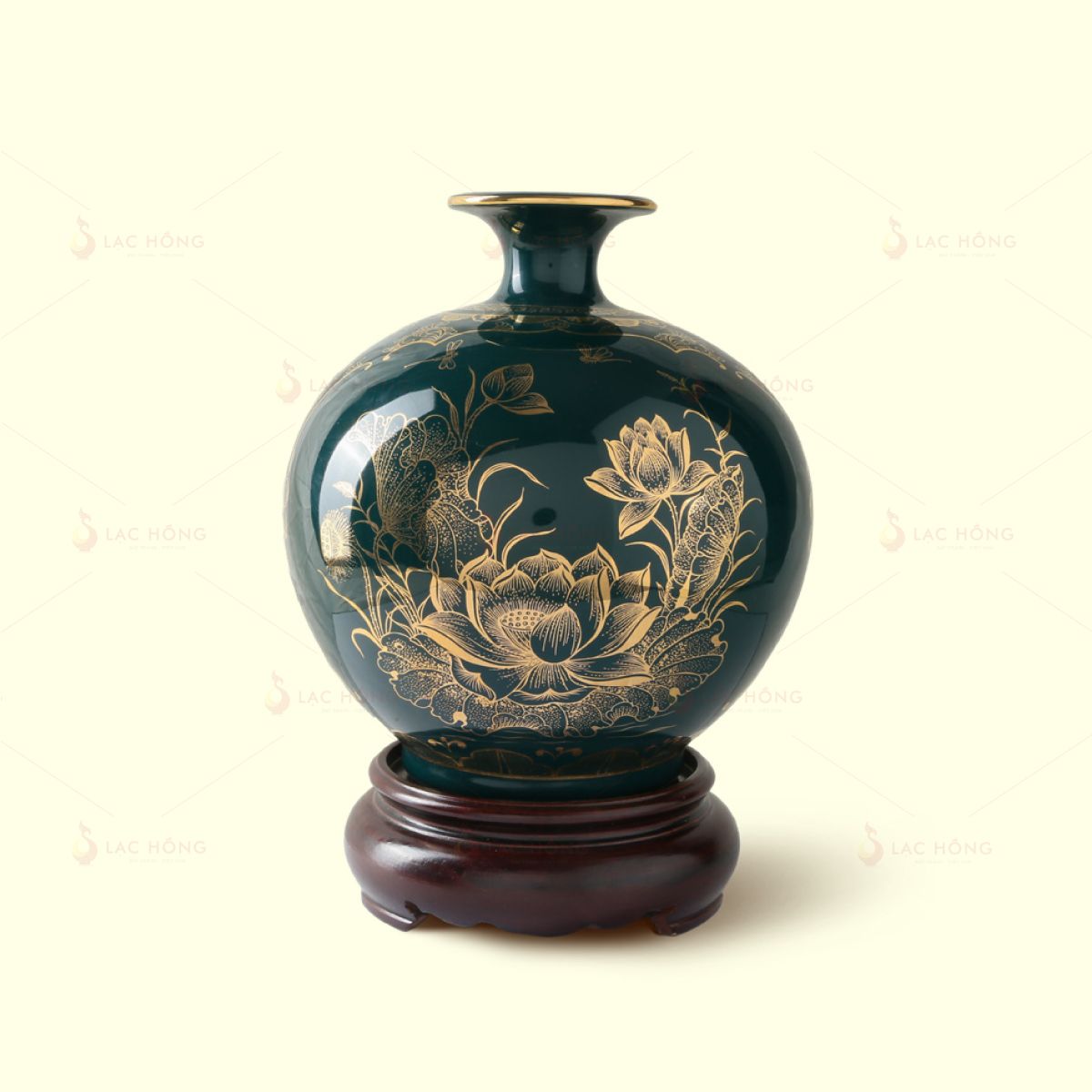Men màu xanh cổ vịt nổi bật, đại diện cho sự phát triển, sinh sôi, sự tĩnh tại và tiền tài bền vững (Mộc và Thủy) trong phong thủy. Họa tiết Sen Đại kẻ vàng tinh tế với hình ảnh hoa sen nở rộ, tượng trưng cho sự thanh cao, không nhiễm bùn, cùng với sự đủ đầy, phát triển viên mãn, được nghệ nhân vẽ tay tỉ mỉ. Các chi tiết còn được nhấn bằng viền vàng 24K làm tăng thêm vẻ sang trọng và giá trị thẩm mỹ.