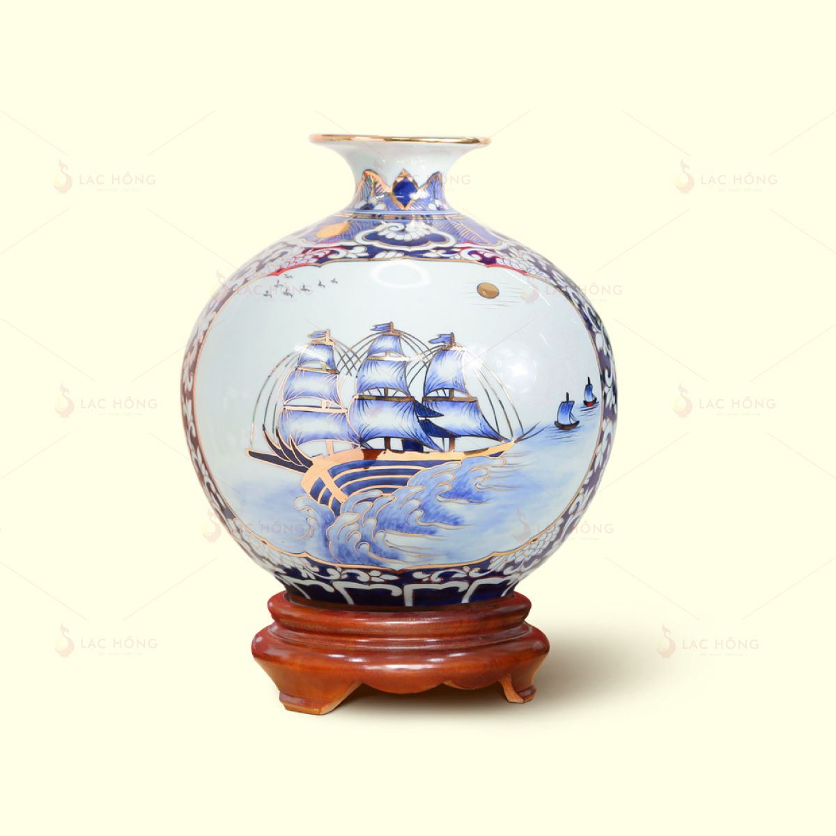 Men màu xanh trắng nổi bật, được xem là biểu tượng của may mắn, địa vị và sự nghiệp thăng tiến trong phong thủy. Họa tiết Thuận Buồm Xuôi Gió kẻ vàng tinh tế hình ảnh thuyền buồm căng gió vượt sóng được nghệ nhân vẽ tay tỉ mỉ. Các chi tiết còn được nhấn bằng viền vàng 24K làm tăng thêm vẻ sang trọng và giá trị thẩm mỹ.